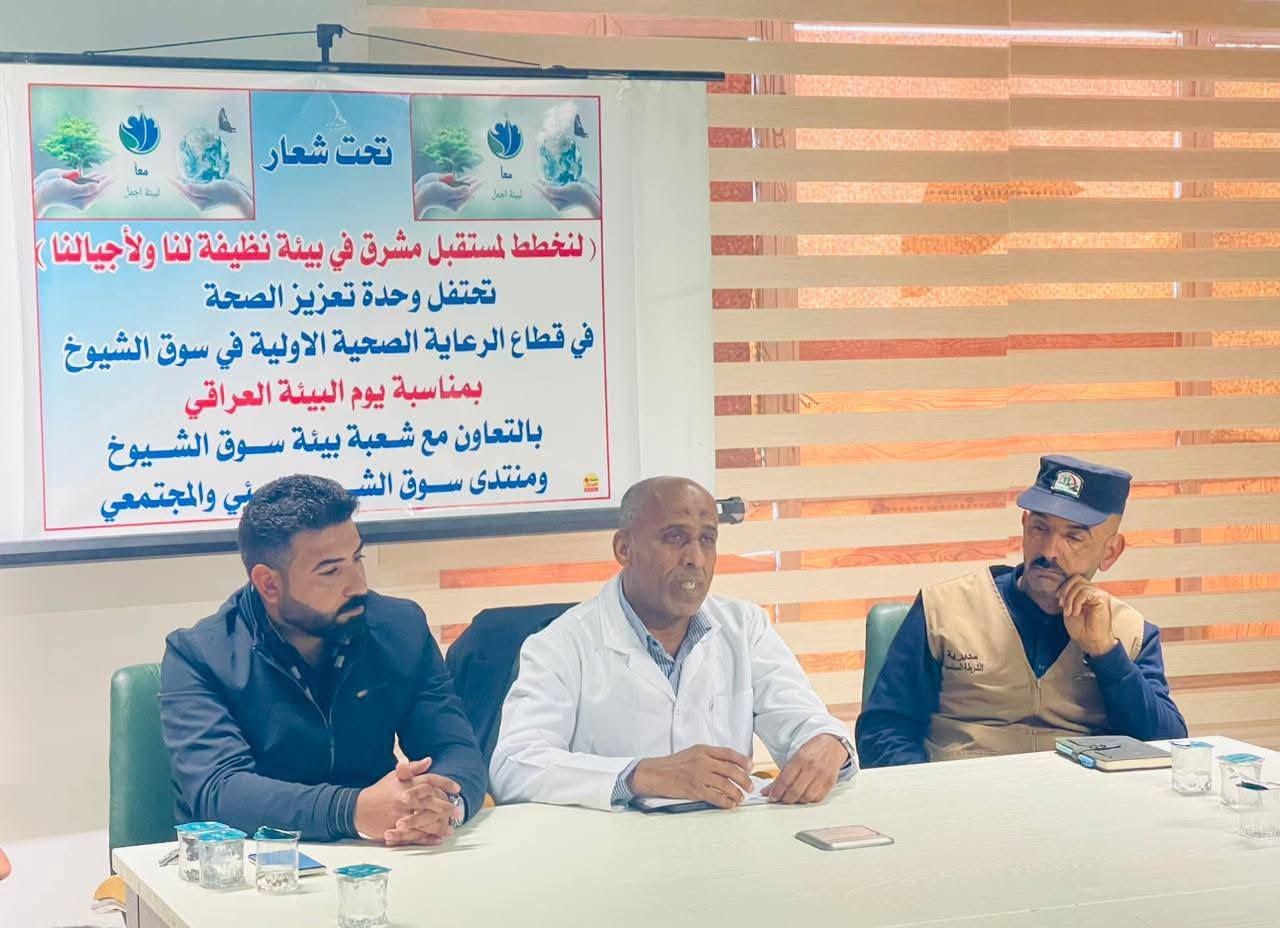 وقال مسؤول وحدة تعزيز الصحة في القطاع صالح غانم محمد ان وحدة تعزيز الصحة وبالتعاون مع وحدات المناخ والامراض الانتقالية والوبائيات في قطاع سوق الشيوخ نفذت احتفالية بمناسبة ( يوم البيئة العراقي ) في منتدى شباب سوق الشيوخ وبالتعاون مع شعبة بيئة سوق الشيوخ ومنتدى سوق الشيوخ البيئي والمجتمعي والشرطة المجتمعية وتحت شعار (لنخطط لمستقبل مشرق في بيئة نظيفة لنا ولأجيالنا ).